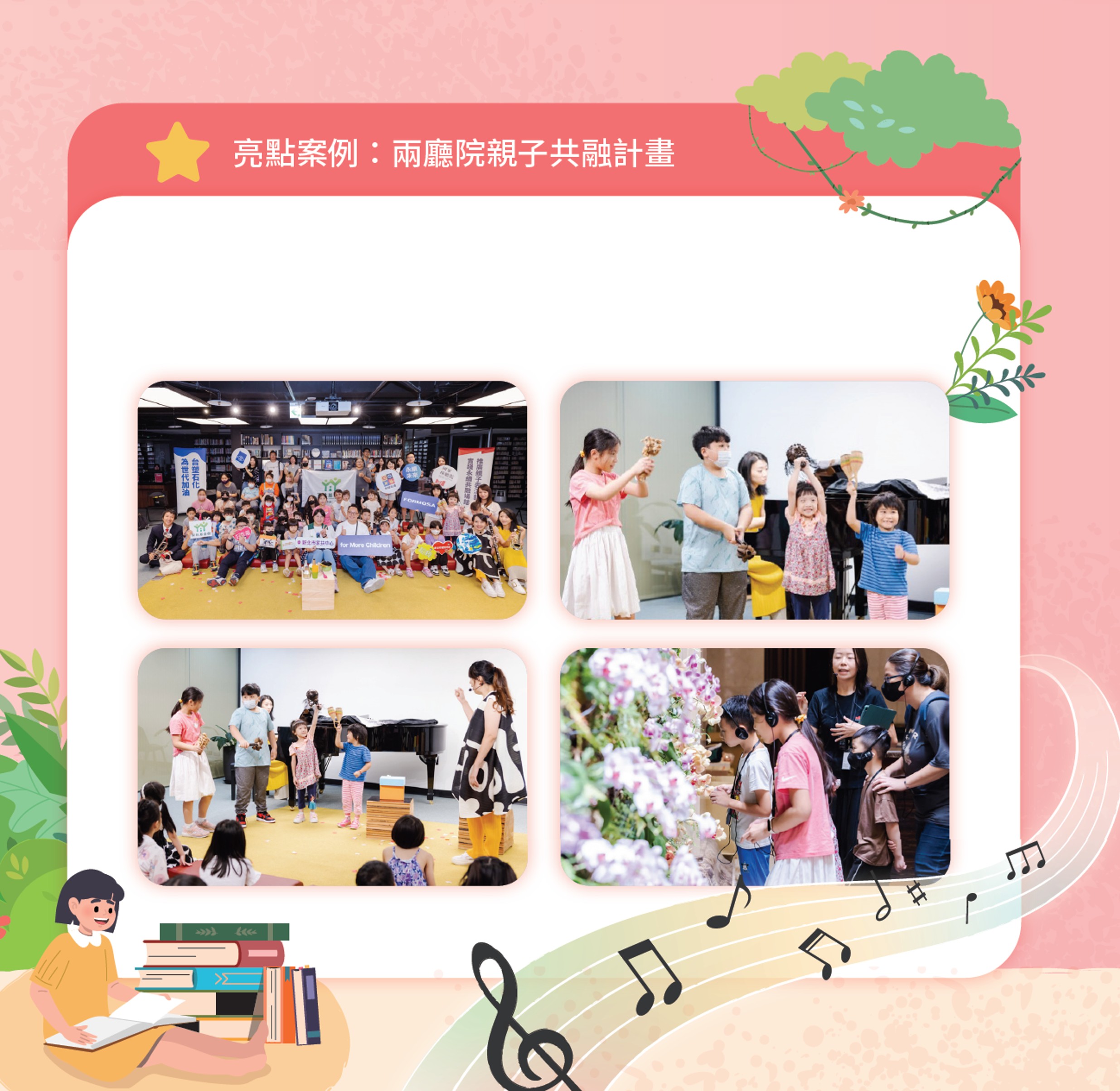 6 月的《莎士比亞先生,您好!》親子說故事活動,利用兩廳院表演藝術圖書館空間創造精彩的場景轉換,並以主角「小哈姆」找爸爸的故事,與觀眾互動、探索莎士比亞的一生。此外,活動也配合當季展覽,延伸介紹莎士比亞相關繪本,透過音樂、戲劇、書籍等多元方式,讓親子更認識這位重要的藝術家。