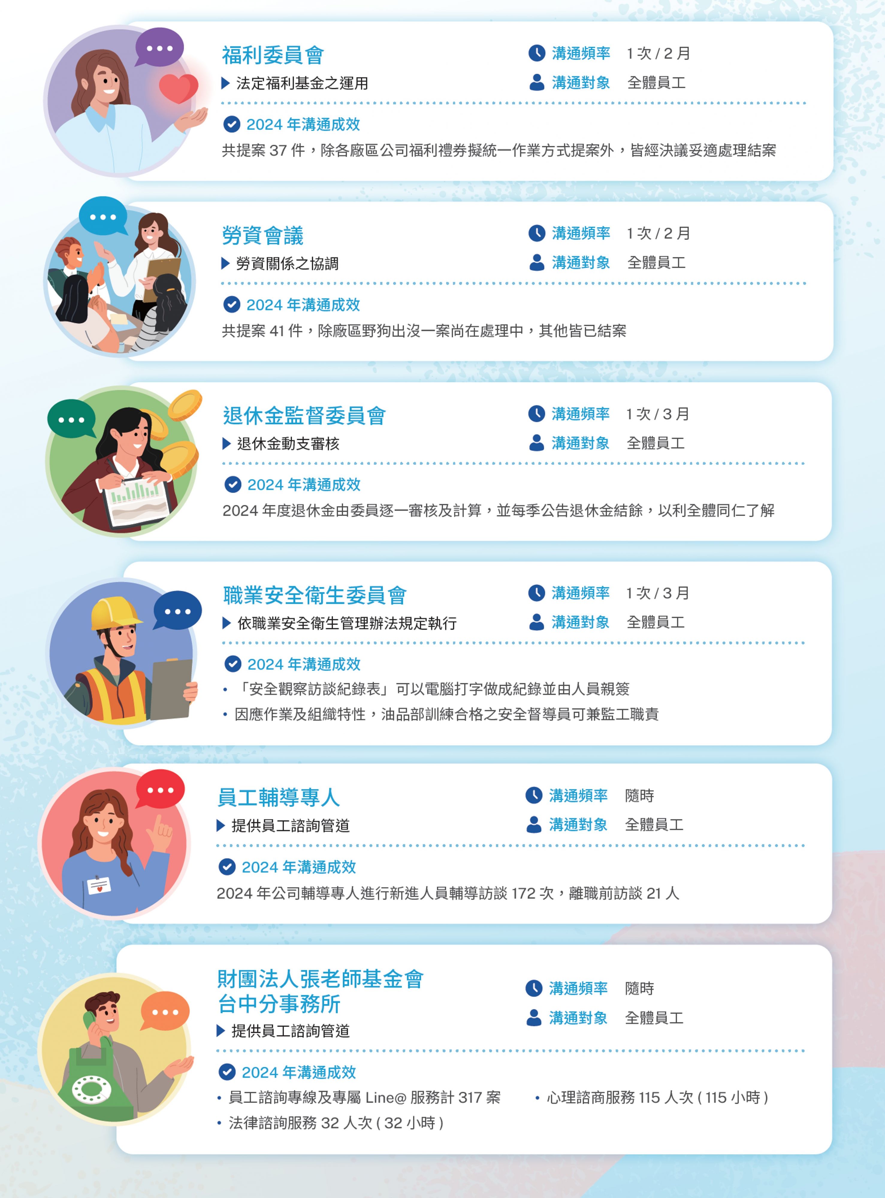 台塑石化有重大營運變化,均依據勞基法及其他法令辦理通知程序,以確保員工享有提前預告的保障。員工可經由福利委員會、勞資會議、工會、職業安全衛生委員會等組織,向公司提出建議,也可透過申訴制度反映問題(申訴辦法)。而勞資會議或與工會之協議,舉凡調薪、年終獎金等,公司所有同仁 100% 皆受其保障。