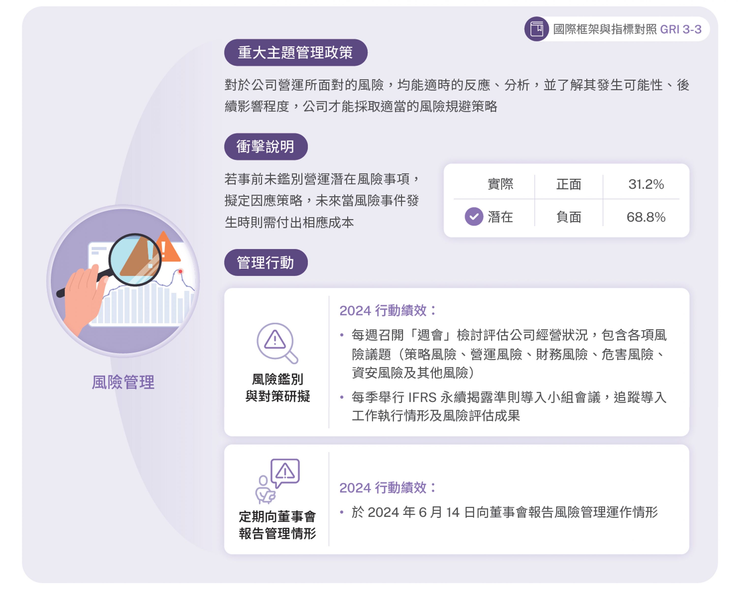 依據本公司「風險管理辦法」,本公司風險管理制度應包含風險辨識、風險分析評量、風險控制處理、風險監督審查、風險資訊溝通與報導等程序。