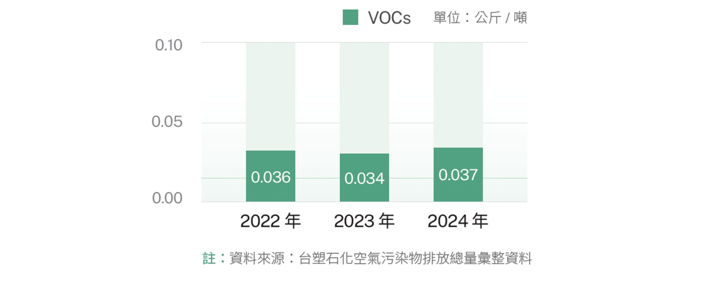 揮發性有機物主要來源為製程 ( 排放管道排放 )、儲槽逸散、裝載操作、廢水處理場與油水分離池逸散、廢氣燃燒塔及設備元件逸散等。2024 年總產能為 28,323 千噸,2024 年單位產品VOCs 排放量較前一年度微幅上升至0.037%,屬近三年合理波動範圍,未來將持續增設空污減排措施( 內浮頂儲槽油氣密閉收集至循環式流體化床鍋爐或油氣回收設施等 ),持續推動單位產品揮發性有機物排放減量。