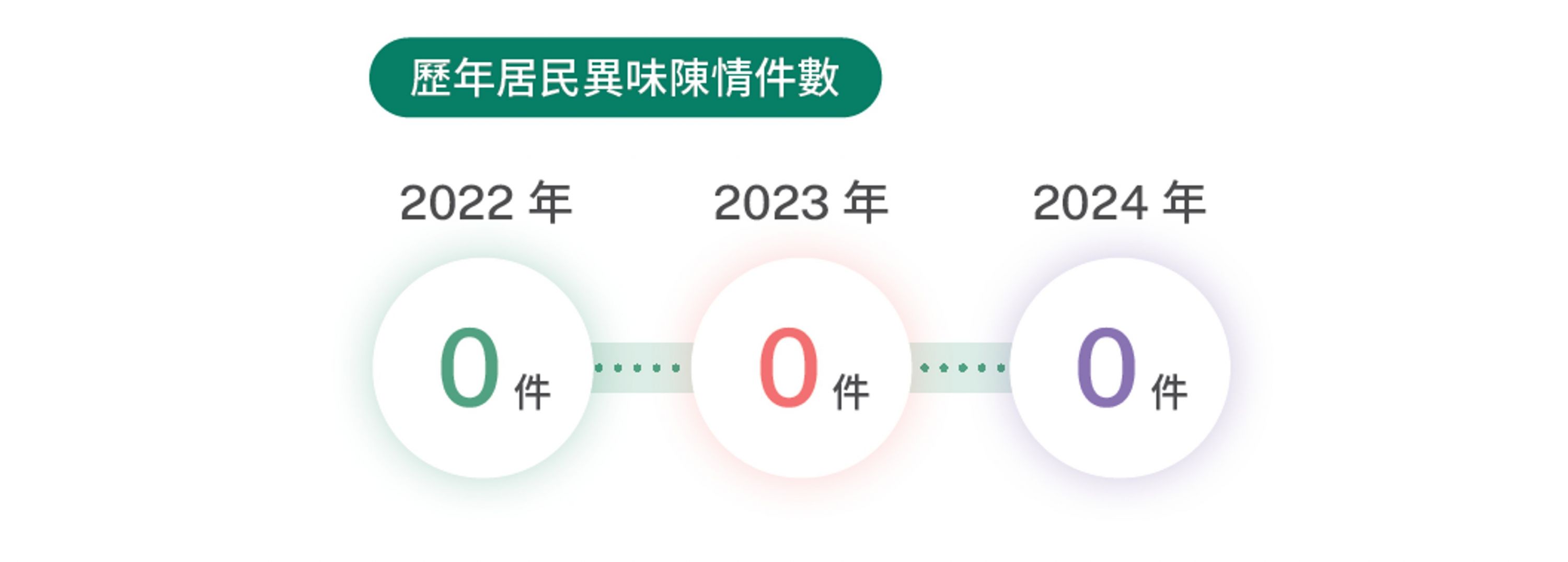 麥寮園區持續推動異味源改善後,鄰近居民對異味陳情已逐年降低,2024 年鄰近居民異味陳情發生件數 0 次,連續多年無居民異味陳情案件,顯見整體管制已具良好成效。