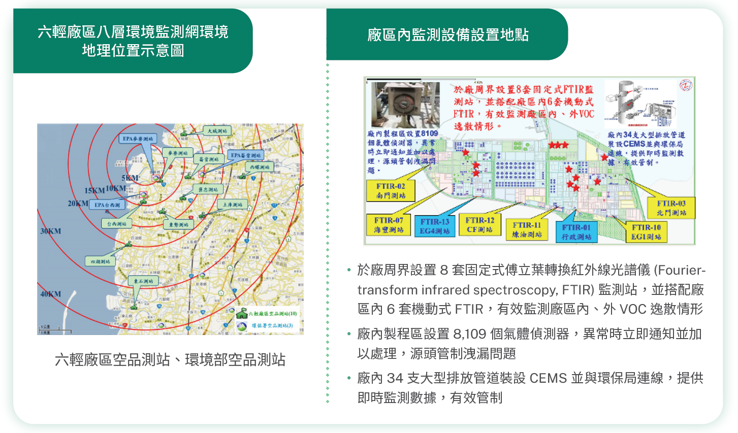 六輕廠區針對空氣品質,打造由內往外八層密集監控的環境監測網,以利儘速追查排放源,確保當地環境品質。