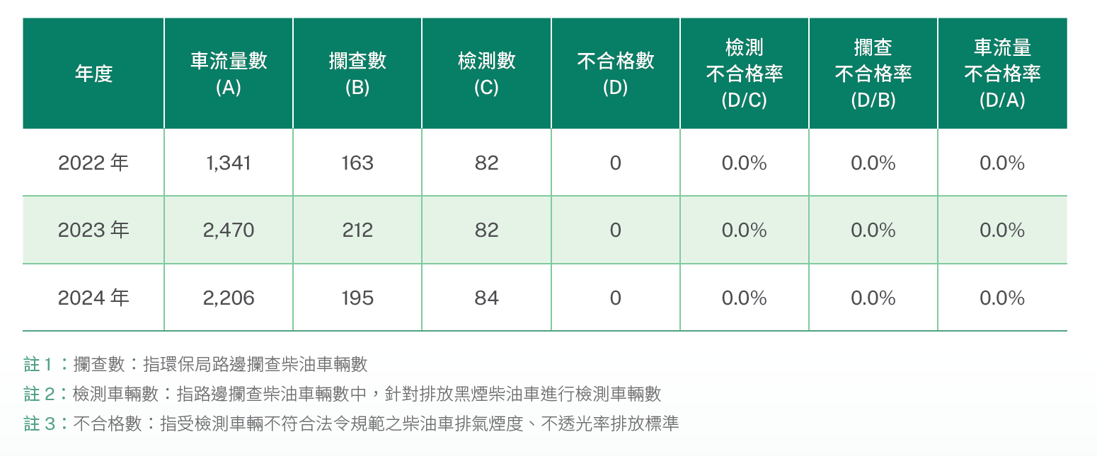 為維護雲林縣空氣品質,規定進出麥寮園區之柴油車輛於申辦入廠證時,需檢附排煙檢測合格文件,如柴油車輛排煙遭主管機關舉發時,廠商需重新檢測並取得合格證明,否則禁止入廠。依雲林縣環保局歷次柴油車排煙檢測統計, 2024 年於進出麥寮園區之鄰近道路進行攔檢作業,攔查柴油車輛數 195 輛,檢測 84 輛( 若當年度未進行排氣定檢,則進行檢測),0 輛不合格,檢測不合格率為 0%、攔查不合格率為 0%,近年攔檢結果如下: