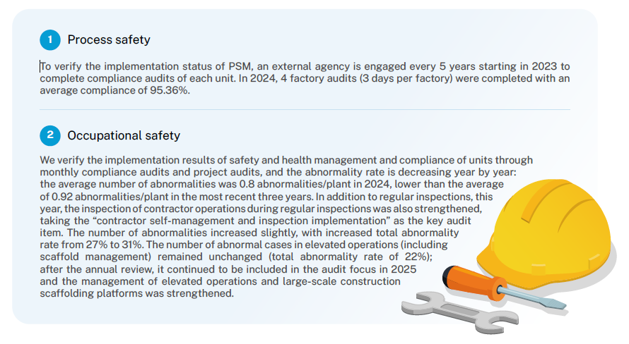 The Company convenes daily toolbox meetings and monthly coordination organization meetings to communicate, promote, and discuss safety and health with contractors. Requirements that must be immediately met are communicated through the messaging group between the Company’s engineering department and contractors. Contractors can use the group to ask questions at any time, and the Company’s personnel will immediately respond and provide assistance.