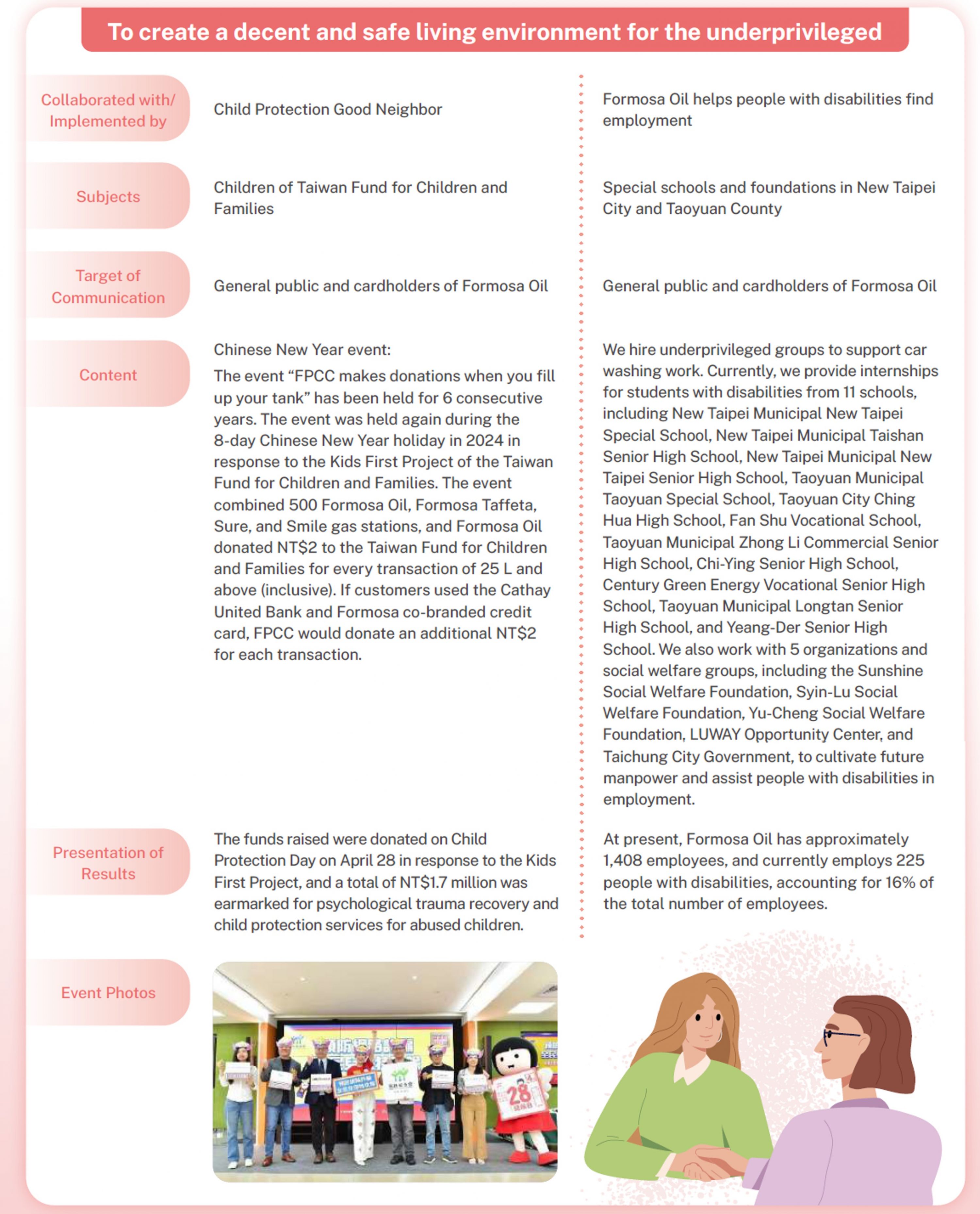 For years, FPCC has cared for the underprivileged. We have set out from our core business with the goal of creating harmony in society in recent years. We began a long-term partnership with the Taiwan Fund for Children and Families in 2019, and combined gas station resources in different counties/cities to join the Child Protection Good Neighbor Project and Project to End Poverty.