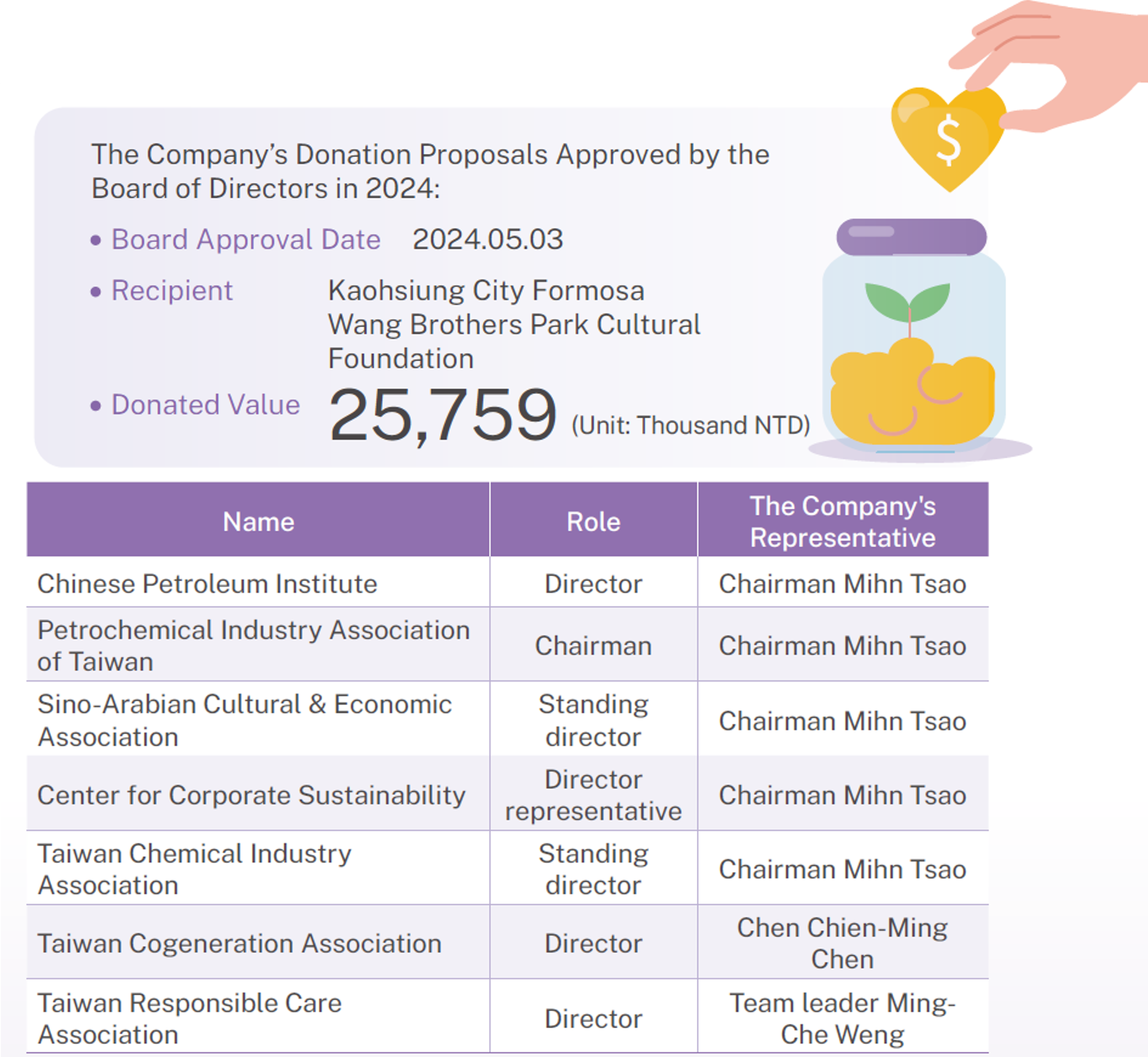 In order to help industries in Taiwan improve their operation outlook, FPCC has been proactively participating in various industrial associations and societies by serving as chairman, director/supervisor, and representative at the said organizations. We conduct exchanges with counterparts on operational experience through associations and organizations, and share the latest market intelligence, supply and demand changes, and technical information, in hopes of making contributions to the industry as a whole. Important positions held by the Company in various associations are described below: