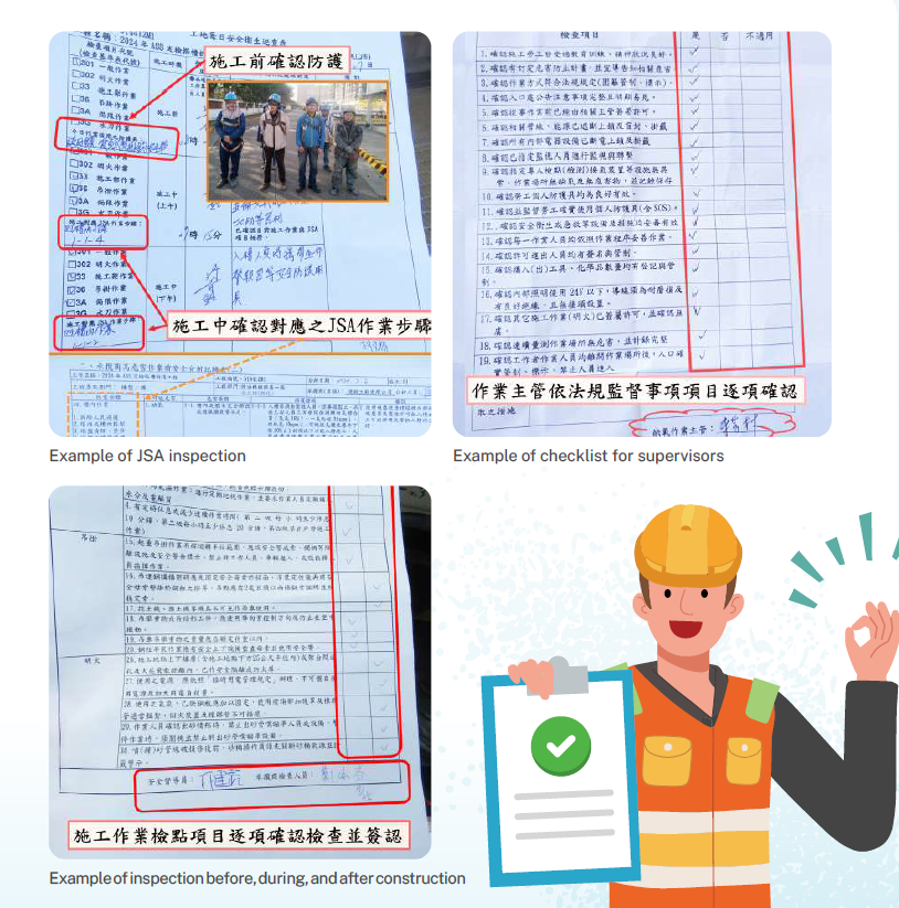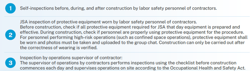The Company convenes daily toolbox meetings and monthly coordination organization meetings to communicate, promote, and discuss safety and health with contractors. Requirements that must be immediately met are communicated through the messaging group between the Company’s engineering department and contractors. Contractors can use the group to ask questions at any time, and the Company’s personnel will immediately respond and provide assistance.