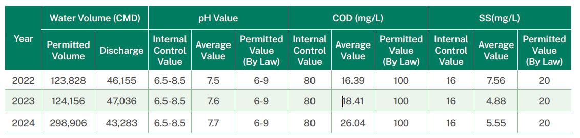 The effluent volume generated throughout 2024 was 43,000 tons per day. The quality of water eventually discharged into the Taiwan Strait met effluent standards after wastewater treatment. The volume of wastewater discharged per unit of product in 2024 was 0.00055 million L/ton, showing steady fluctuation. In the future, we will continue to evaluate and develop wastewater recycling and reuse (e.g., collecting process sour water to the FGD system) and wastewater treatment facility modification to increase the volume recycled, in order to continue reducing the wastewater discharge per unit product.